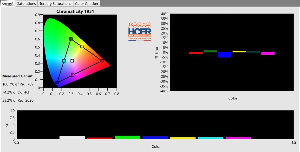 Le gamut REC709 est un peu court, le blanc tire sur le jaune (bien visible à l’œil). Colorchecker et teintes de peau, dérives de 4.3 (au-dessus de 3, l’œil le voit).