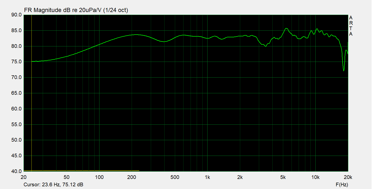 L’inconvénient : une fin de bande avec une ou plusieurs résonances très énergiques. Pour le tweeter, on s’en fiche, à 27kHz on n’entend plus rien. Pour le grave-médium, c’est plus délicat, le 5kHz n’étant pas très éloigné de la fréquence la plus basse pouvant être reproduite par le tweeter.