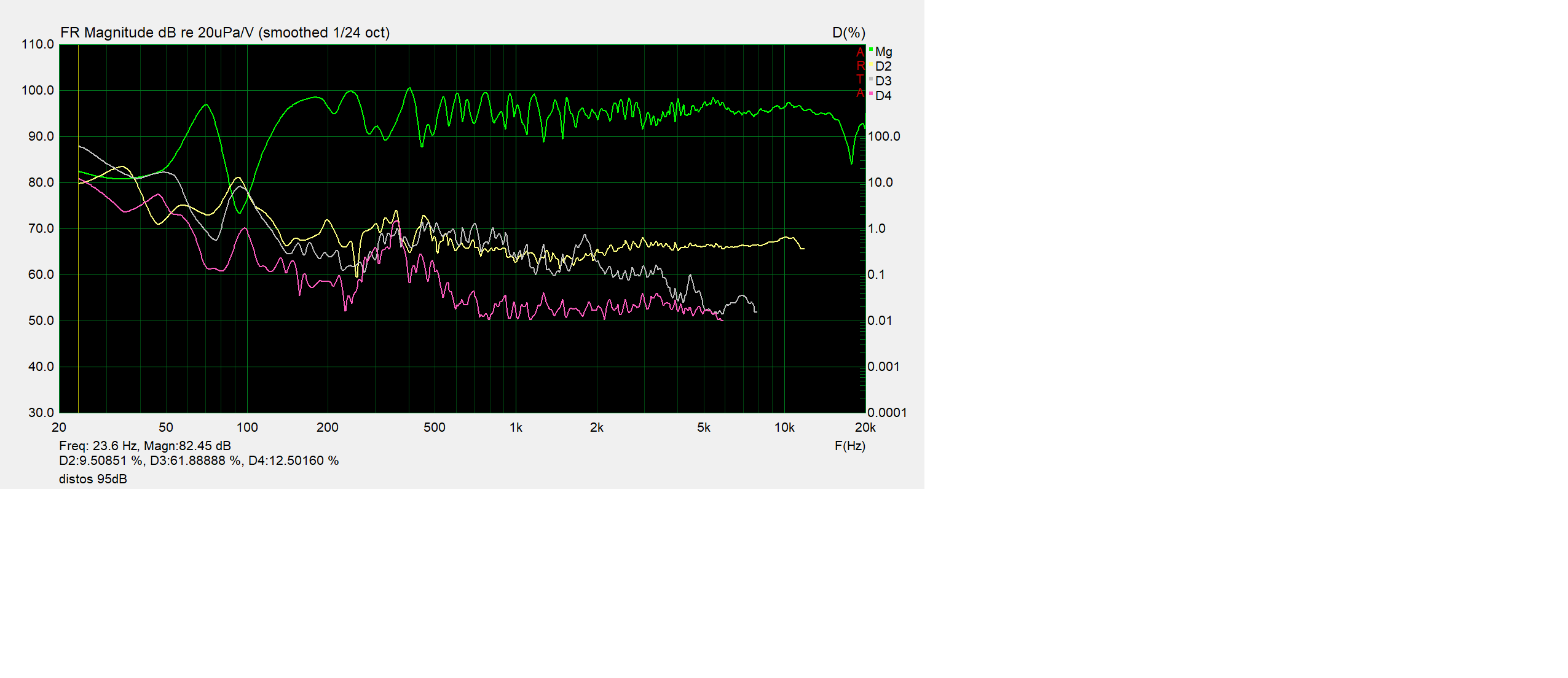 - Distorsions à 95dB (mesure à 1M): rappel : sous 100Hz on mesure la pièce, pas l’enceinte ; le niveau de distorsion ne dépasse pas 1% sur l’ensemble du spectre ; belle performance pour un grave-médium de cette dimension, notamment dans le bas-médium où une membrane rigide donne souvent ses meilleurs résultats.