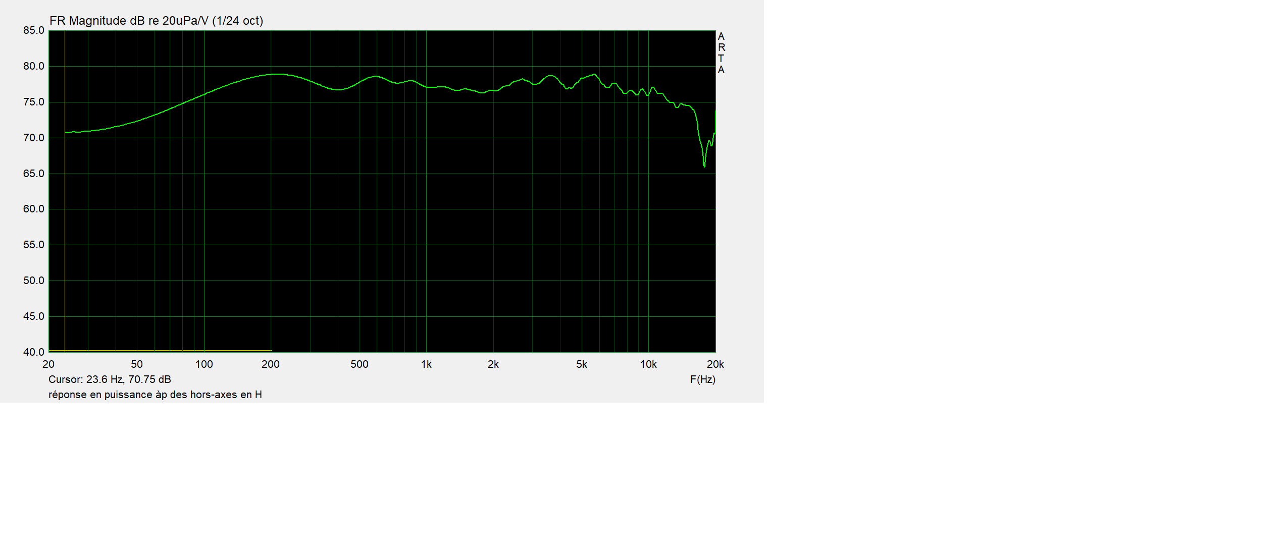 - Réponse en puissance : moyenne des courbes dans l’axe et hors-axes Horizontaux : hormis un léger creux entre 900 et 2.1kHz, elle est bien linéaire, préjugeant d’un bon équilibre tonal dans des pièces domestiques semi-réverbérantes.