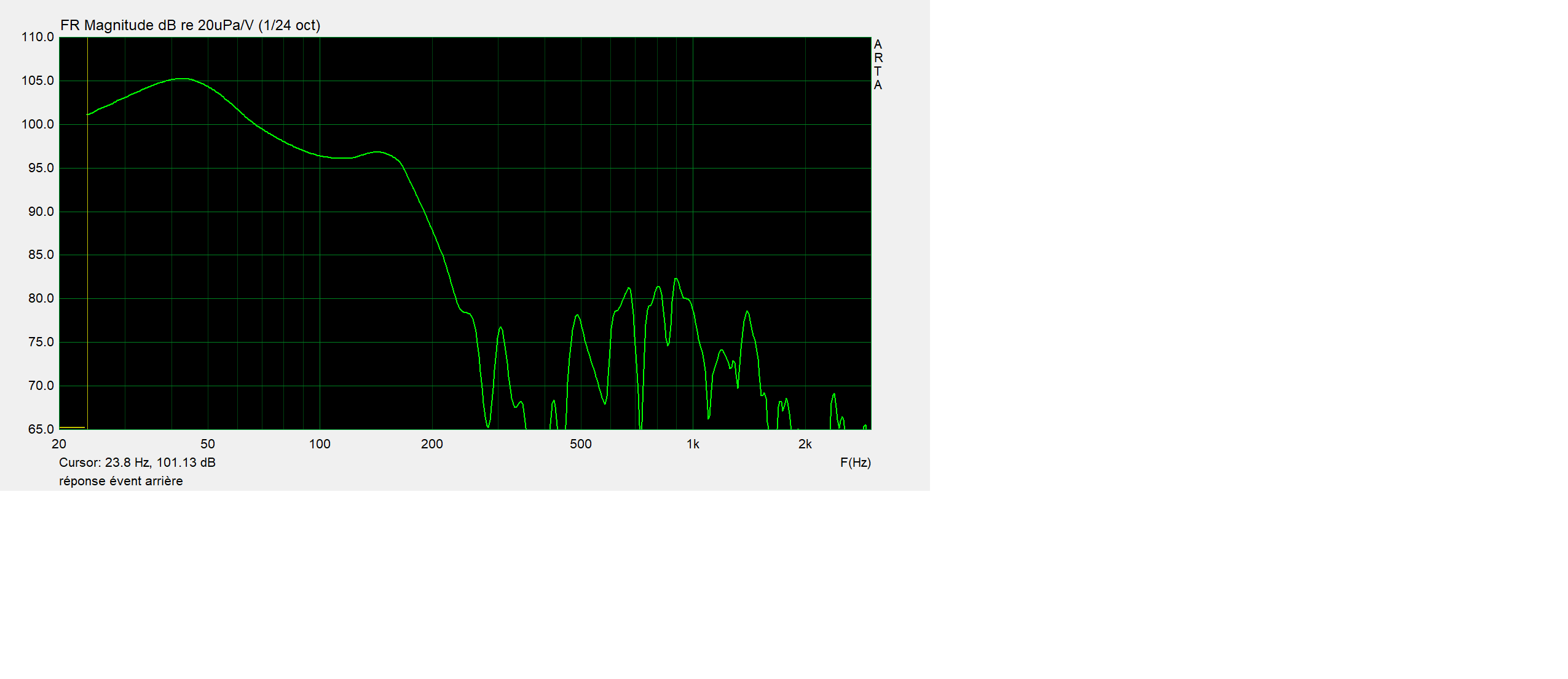 - Réponse en fréquence en sortie d’évent arrière : typique d’un bass-reflex ; il n’est pas impossible qu’un peu de médium s’échappant de l’évent arrière soit responsable des distorsions visibles de 400 à 1kHz ; toutefois, à distance d’écoute normale, cette caractéristique a bien des chances de rester inaudible.